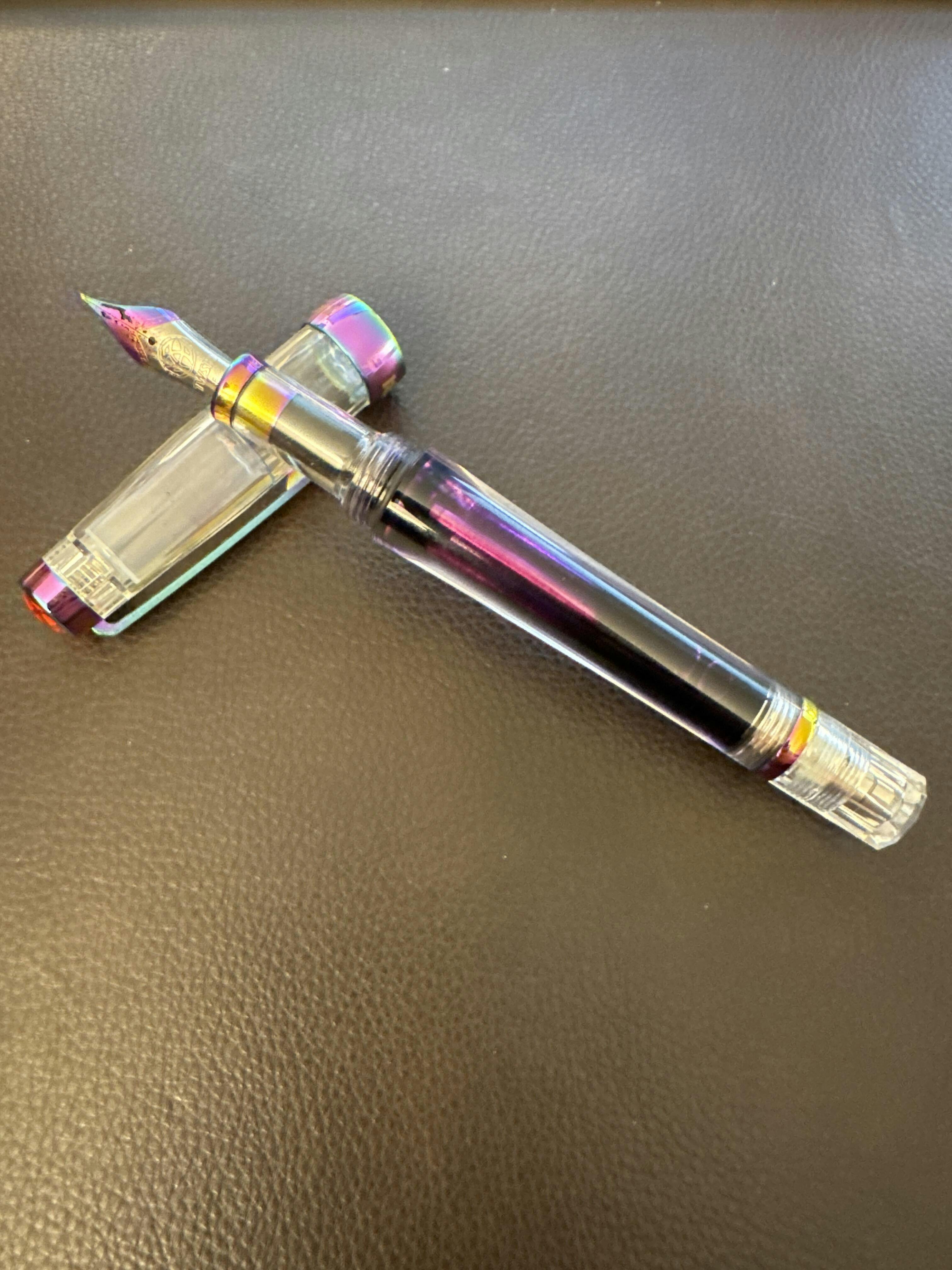 The TWSBI Vac700R Iris comes with a vacuum filler mechanism. This fountain pen features a clear demonstrator body with rainbow-colored iridescent trim and a stainless steel nib accented with iridescent color. No two are exactly alike.