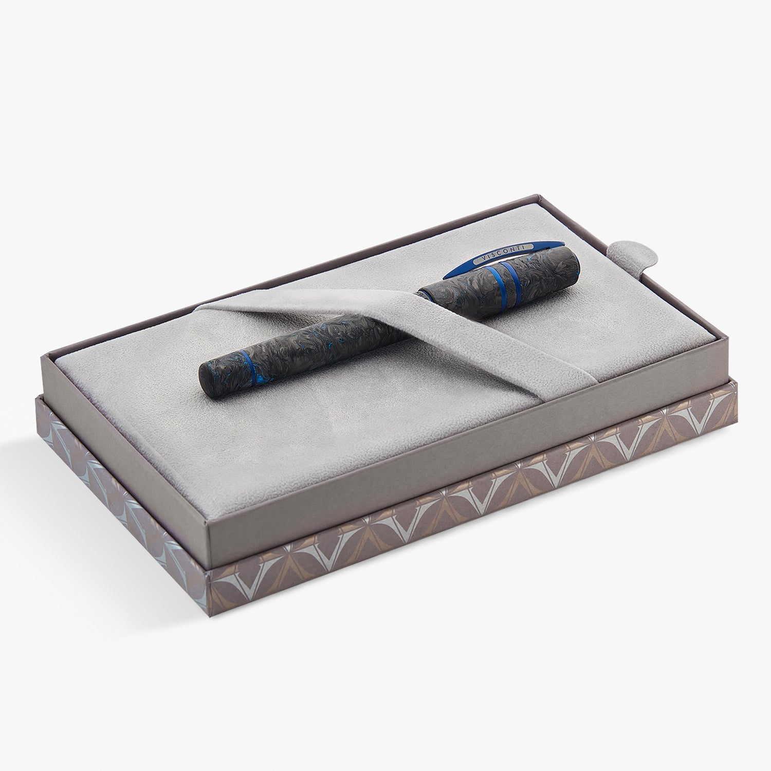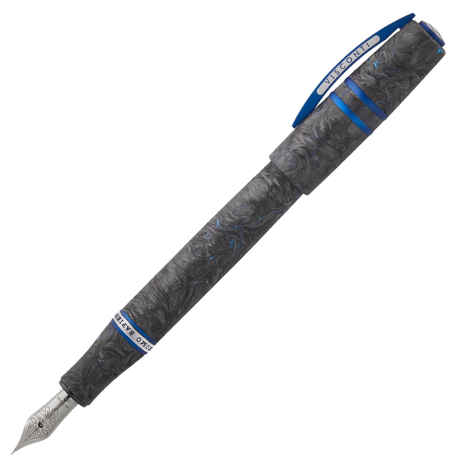 In harmony with these chromatic vibrations, all Ergal metal parts undergo a deep-blue anodization process. This finish not only enhances resistance to corrosion and scratches but also gives the product a unique stylistic identity. On the clip, the Visconti logo is highlighted with a delicate laser engraving, revealing the natural color of the underlying metal and creating an elegant contrast.
