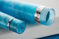 Two spectacular but uniquely different resins were selected for their irresistible display of vibrant, shimmering colors: Unicorn Galaxy and Fire Opal. Both resins were selected for their color saturation and mystifying swirling. The Unicorn Galaxy has a spray of silver flecks spiraled in with the turquoise color along with some lavender purple highlights. It is complemented by palladium-plated trim and a 14k gold nib.
