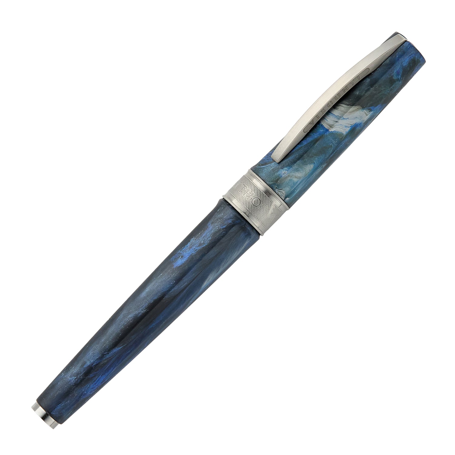 The Poseidon pen is a stunning example of Visconti's design philosophy. The dark sea blue resin captures the essence of the deep sea, where Poseidon was believed to dwell and rule over the waves and storms. In coordination with the dark color of the resin, for the first time in the collection, features a ruthenium nib and trims. Both the pen's body and trims are sandblasted to create an elegant contemporary feel to the design.