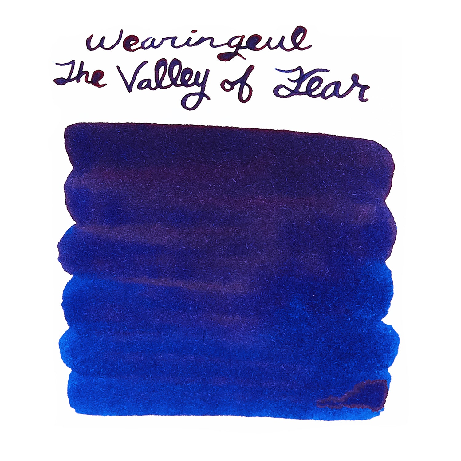 The Valley of Fear (Arthur Conan Doyle) fountain pen ink is a dark blue with red sheen. It's an ink that vividly embodies the Valley of Vermissa, and the red and blue contrast to create an eerie and intense atmosphere.